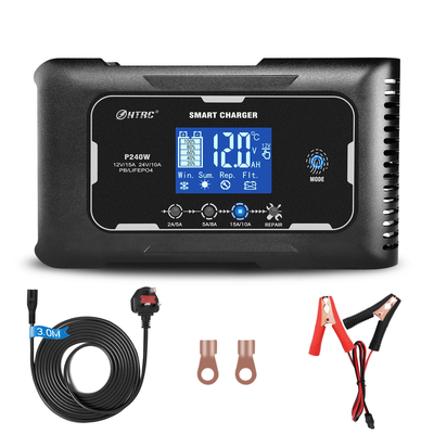 Spécification: Modèle de produit : P240 W Entrée CA: 100-240V 50/60HZTension de sortie : 12 V/24 VCourant de sortie: MAX 15A pour batterie 12V, MAX 10A pour batterie 24 V Tension de démarrage : 7, 0 VDimensions: 15, 8 x 9 x 5 cm Poids net : 470 g Emballage inclus :1X HTRC chargeur de voiture Batterie