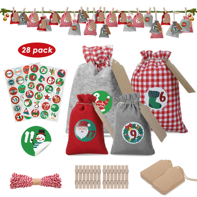 La description :JOYXEON 28 PCS Noël Suspendus Calendriers De Lavent Compte À Rebours Cordon Cadeau Sacs Bonbons Biscuit Pochettes Présent Emballage Cadeau Caractéristiques :- Calendrier de l Avent à remplir Cet ensemble mignon offre tout ce dont vous avez besoin pour créer un calendrier de lavent individuel. Les 28 sacs en tissu de Noël composés de sacs en jute et de sacs en feutre sont remplis de belles surprises et décorés avec les autocollants. Avec la corde, les sacs peuvent être facilement ouverts et fermés et les décorer avec un autocollant numérique. Vous pouvez écrire votre propre idée de bricolage ou félicitations sur la surface du papier kraft.- Pratique pour accrocher Calendrier de l Avent 2020 sacs en feutre, grâce à 28 grandes pinces à linge en bois, vous pouvez les coller sur des tentures murales ou sur le tableau. Calendrier de l Avent fille vous 28 rangs de sacs brodés avec amour sur env. Corde de jute rouge de 10 m de long et peut être remplie individuellement