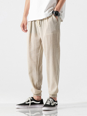 La description: Type darticle: pantalon Type dajustement: Régulier Type de fermeture: taille élastique, cordon de serrage Sexe: Hommes Décoration: Couleur unie Matériel: Lin de cotonÉpaisseur: Standard Décoration: Poches, Cordon Style: Décontracté, Mode Saison: printemps, automne, hiver Type de taille: Mid Rise Couleur: vert foncé, gris, beige, kaki, bleu marine, bleu clair, noir Type de pantalon: Pantalon droit Longueur: Long Occasion: loisirs, vie"idienne Le forfait comprend:1 * Pantalon Plus de détails:
