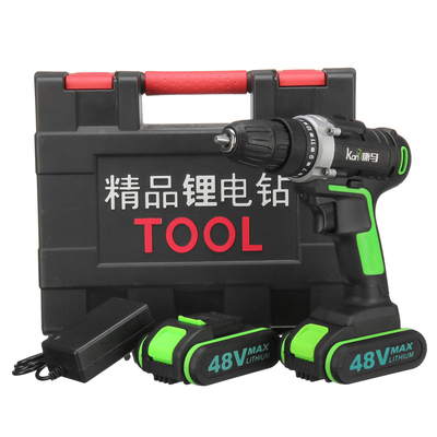 Perceuse sans fil Double vitesse de réglage LED éclairage 1 / 2 Pcs Batterie de grande capacité 15 + 1 réglage du couple 0-350r / min, 0-1450r / min Caractéristiques: 1. Alimenté par une batterie rechargeable LI-ION de 48 V, offre une durée de fonctionnement plus longue et plus de puissance.2. 15 + 1 ajustement du couple, offre 15 + 1 réglages du couple, ajustez au besoin.3. Variable haut / bas à 2 vitesses, 0-350 tr / min et 0-1450 tr / min Variable haut / bas à 2 vitesses, pour une large gamme dapplications.4. Avec la lampe de travail LED, fournit un éclairage dans les espaces sombres lorsque vous travaillez.5. La poignée ergonomique et confortable assure léquilibre et le contrôle des outils 6. Commutateur marche avant / arrière / verrouillage 3 in 1, supporte la conduite avant / arrière et le verrouillage de sécurité.7. 3 réglages de scène. 3 modes de perçage (Hammer, perçage à plat, perçage à plat et vis) pour un travail de haute précision. 8. Le corps est étanche, peut être adapté aux besoins du travail sous leau (Remarque: la batterie nest pas étanche) Spécification: Entrée: 100-240V ACTension de la batterie: 48V max Max. Couple: 25 ~ 28nm Vitesse sans charge: 0-350r / min, 0-1450r / min Chuck: 0.8-10mm Couple: ajustement du couple 15 + 1 Couleur: noir et vert Taille: 190mm * 200mm / 7.5 * 8.7 Contenu du coffret: 1 x perceuse sans fil 1 chargeur Batterie 1 ou 2 x Batterie 1 x manuel dutilisation