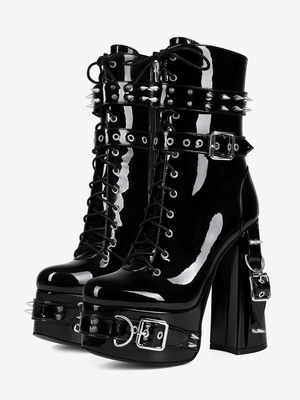 Bottes sexy pour homme en cuir verni noir à lacets et boutons avec talon compensé. & Chaussures homme > Bottes sexy pour hommes