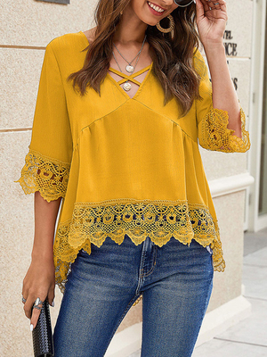 Chemisier Pour Femme Jaune Dentelle Col En V Décontracté Demi Manches Criss Cross Polyester Tops & Mode Femme > Top > Blouses