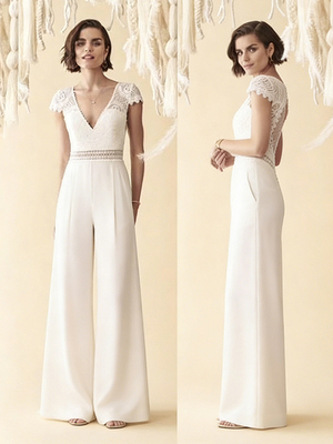 Combinaison de mariée en crêpe stretch et dentelle longue jusquau sol col V manches courtes taille naturelle couleur ivoire. & Mariage > Robes de mariée > Combinaison de mariée ...