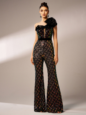 Combinaison sirène à paillettes avec détails floraux tenue de soirée tendance à une épaule pour femme 2025 & Mode Femme > Combinaison Femmes