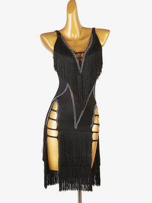 Costume Robe De Danse Latine Noir Robe Fendue Femmes Strass Frange Dos