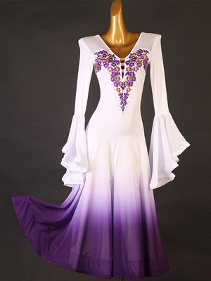 Costumes De Danse De Salon Manches Longues Volantes Violet Femmes Élégantes Lycra Spandex Fleurs Robe Vêtements De Danse & Déguisement > Costume > Costumes de Danse > Costumes de danse de bal