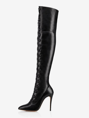 Cuissardes Bottes Noires Sexy Femme Bout Pointu Lacets Talon Aiguille