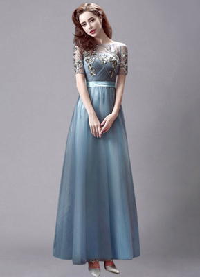 Encre bleue robe Illusion Tulle robe de partie Applique Manche courte cheville longueur Homecoming robe de bal & Mariage > Robes de Cérémonie > Robes de bal