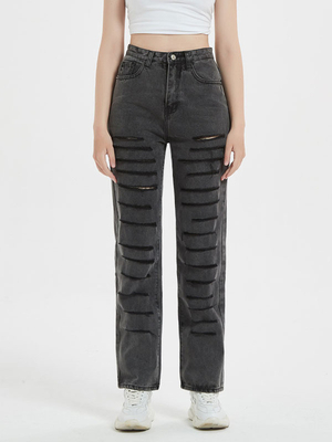 Pantalon en Denim Long Déchiré Femme Coupe Cintrée à Zip avec Bouton avec Poches Unicolore & Mode Femme > Bas Femmes > Pantalons