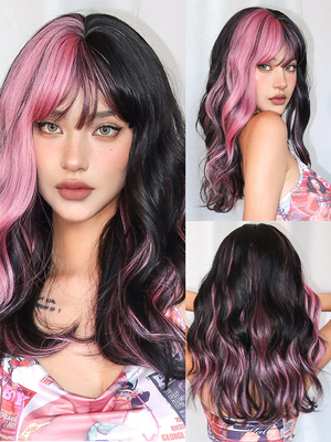Perruques synthétiques noires ondulées et bouclées avec raie au milieu et frange rideau (2025) & Mode Femme > Accessoires > Perruques des Femmes > Perruques Synthétiques > Perruques synthétiques longues ...
