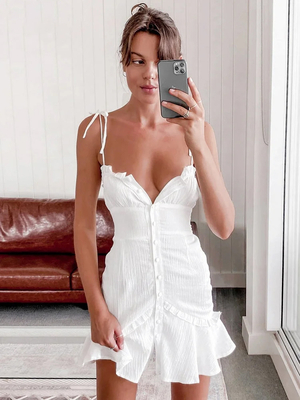 Petite robe blanche bretelles à nouer boutons devant dos nu mini robes de remise de diplôme & Mode Femme > Robes > Robes d'été