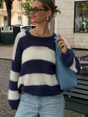 Pull Blanc Bleu Bicolore À Col Rond Femme Coupe Ample Décontracté En Polyester & Mode Femme > Top > Pulls