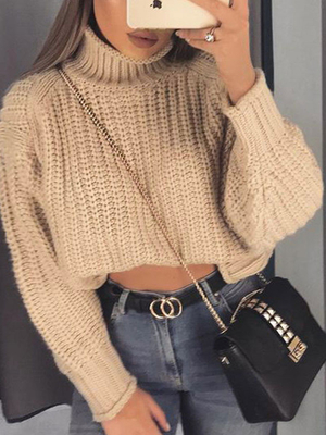 Pull en Côtelé Taille Haute Femme à Col Montant avec Manches Longues Unicolore Pull Femme & Mode Femme > Pull-over > Pulls