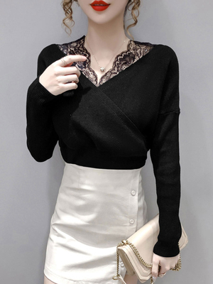 Pull Femme Pull En Dentelle Noire Col En V Manches Longues Polyester Pulls Chemise & Mode Femme > Pull-over > Pulls