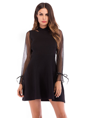 Robe Ballet Femme à Col Rond Courte Coupe Cintrée avec Manches Longues Dentelles Bas Evasée Unicolore Noir Robe Femme & Mode Femme > Robes > Robes patineuses