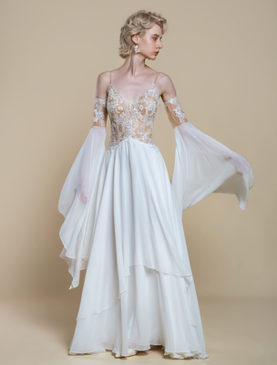 Robe de mariée bohème en polyester et dentelle coupe trapèze avec traîne taille naturelle bretelles spaghetti fermeture éclair manches longues décolleté conçu ivoire & Mariage > Robes de mariée > Robe de mariée bohème