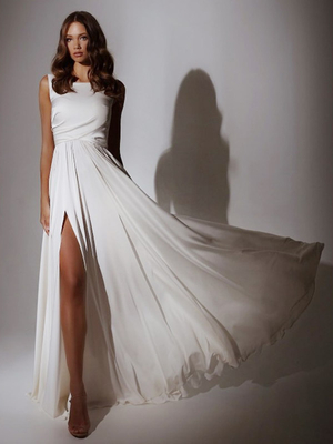 Robe de mariée simple col carré jupe fendue plissée au sol & Mariage > Robes de mariée > Robe de Mariée Simple