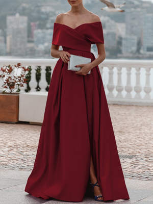 Robe de soirée trapèze en satin à épaules dénudées et traîne plissée & Mariage > Robes de Cérémonie > Robes de soirée