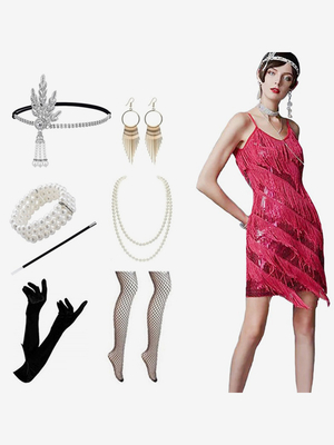 Robe Ensemble Rétro Rose Femmes Accessoires À Franges Vintage Marie-Antoinette 18ème Siècle Bourgogne & Déguisement > Costume > Costumes Vintages > Mode années 1920