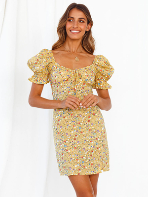 Robe Eté Courte Imprimés Fleuries Femme avec Manches Courtes à Col en Carré Coupe Cintrée Bicolores Robe de Patineuse Sexy & Mode Femme > Robes > Robes d'été ...