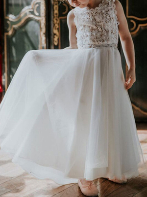Robe fille de fleur saumon rose en tulle col rond en dentelle zip sur dos robe cortège enfant & Mariage > Robes de soirée pour mariage > Robes cortège enfant ...