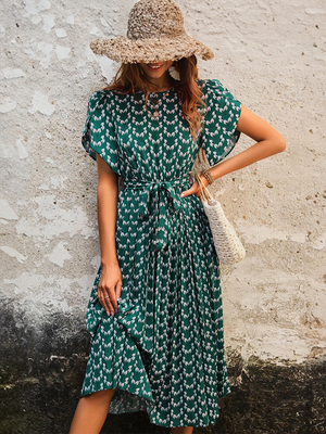 Robe Fleurie Robe Mi-Longue Bohème Ceinture Extensible Col Rond Manches Courtes & Mode Femme > Robes > Robes de Bohème