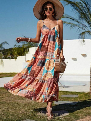Robe longue à encolure en V Robe longue sans manches en polyester à imprimé floral & Mode Femme > Robes > Robes imprimées