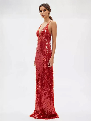 Robe longue à paillettes en rouge décolleté en V profond bretelles spaghetti robe longue de soirée formelle sexy pour femmes 2025 & Mode Femme > Robes > Robes de soirée