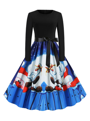 Robe rétro des années 1950 bleue modèle de Noël femme robe évasée à manches longues & Mode Femme > Robes > Robes Rétro Vintage