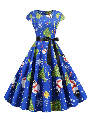 Robe rétro des années 1950 bleue modèle de Noël femme robe évasée manches courtes & Mode Femme > Robes > Robes Rétro Vintage