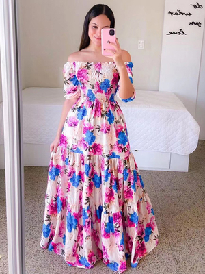 Robe smockée à fleurs épaules dénudées robes dété décontractées à plusieurs niveaux & Mode Femme > Robes > Robes Fleurie