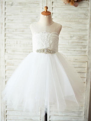 Robes cortège enfant perlée sans manches illusion décolleté écru blanc robes de soirée pour enfants & Mariage > Robes de soirée pour mariage > Robes cortège enfant