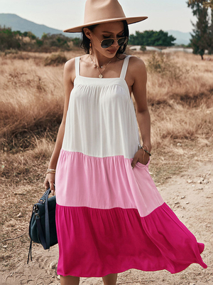 Robes Droites Femmes Mi-Longues avec Bretelles à Col Carré avec Poches Bas Evasée Cousu Tricolores Robes Etés & Mode Femme > Robes > Robes droites