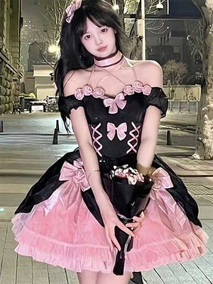 Robes Lolita gothiques élégantes à lacets et nœuds couleur noir rose Lolita JSK & Vêtements de Lolita > Robes Lolita > lolita douce