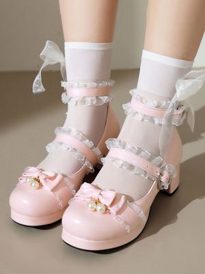 Sweet Lolita Footwear Escarpins Lolita en cuir PU à bout rond avec nœuds roses & Vêtements de Lolita > Chaussures Lolita