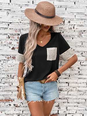 T-shirt col V avec manches scintillantes et poche avant 2026 & Mode Femme > Top > Tee shirts