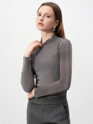 T-shirt en maille transparente pour femme haut à col roulé à volants et manches longues avec strass 2025 & Mode Femme > Top > Tee shirts