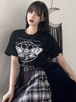 T-shirt noir pour femmes à col bijou et haut en coton à manches courtes & Déguisement > Costume > Costumes Vintages > Gothique Vêtement