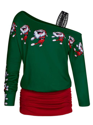 T-shirt Top Femmes Manches Longues avec Epaules Nus Courte Imprimé avec Motifs NOEL Dentelles Bicolores & Mode Femme > Top > Tee shirts