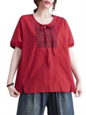 Chemisier ample pour femme Broderie à manches courtes T-shirts de vacances vintage grande taille