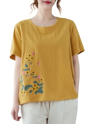Femmes Blouse ample Floral brodé à manches courtes Vintage T-shirts