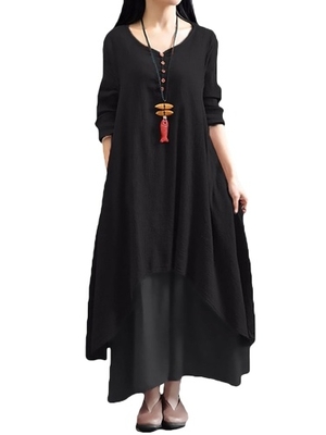 Nouveau Mode féminine Casual Robe ample à manches longues solide Coton Lin Boho longue Maxi Dress
